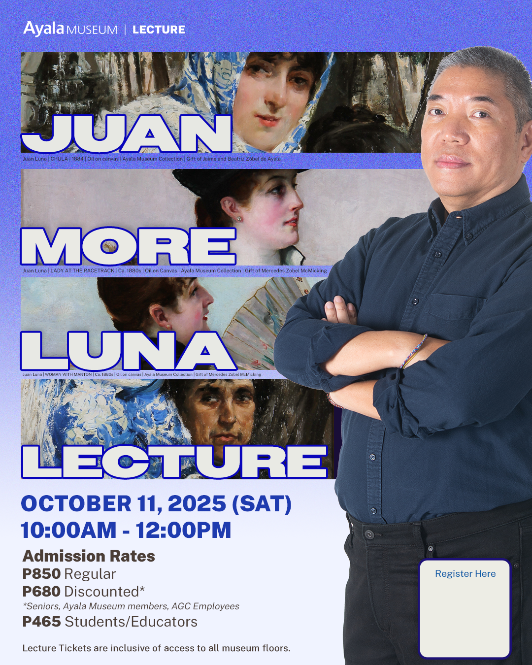 In celebration of Juan Luna’s Birth Month, join Ambeth Ocampo in this history lecture as we take another look into the life and times of this Filipino artist. All tickets come with access to lecture and unlimited access to the museum for the day.