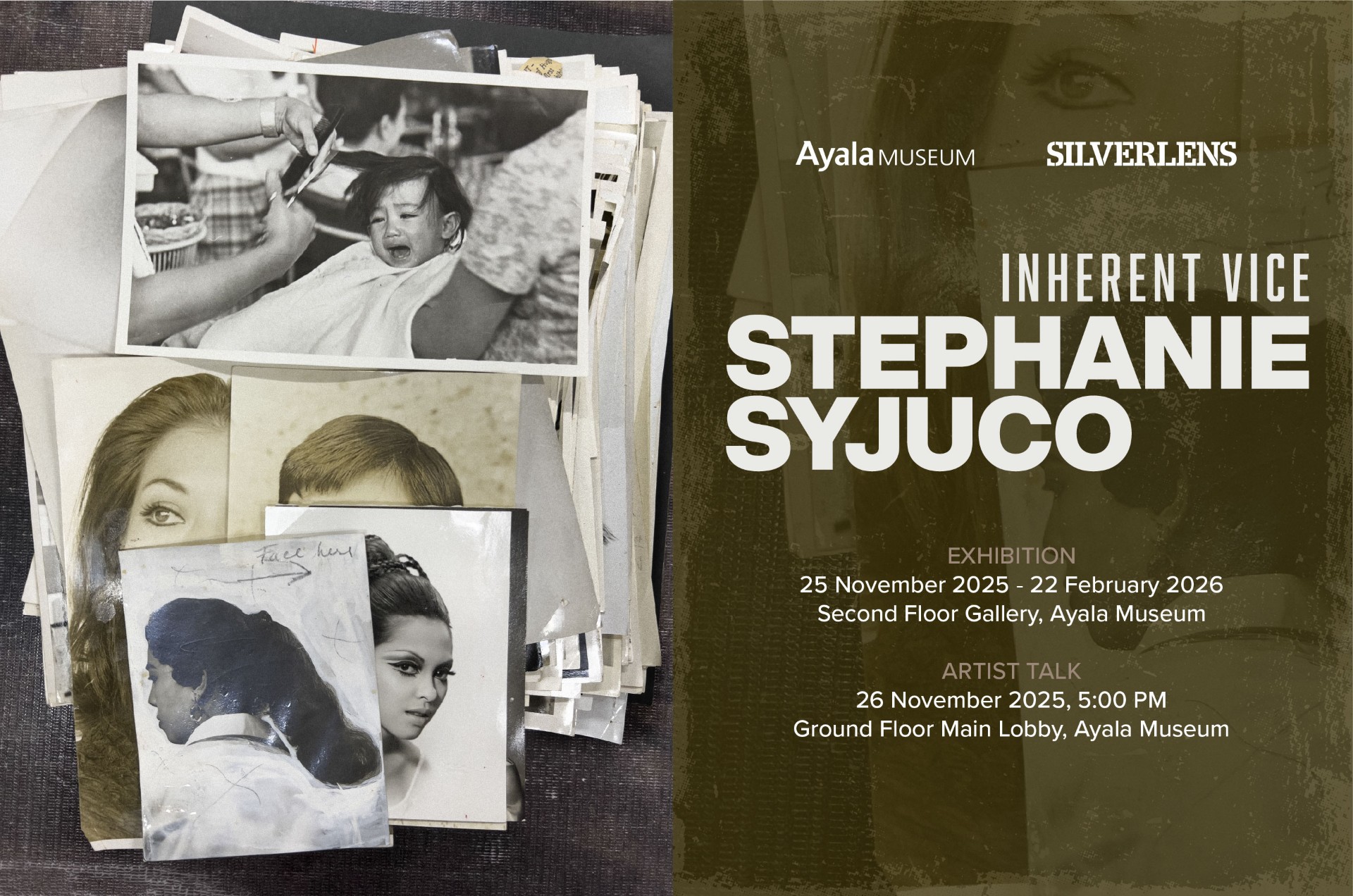 Join us for an artist talk with Stephanie Syjuco, whose exhibition Inherent Vice examines a pivotal period in Philippine history through press photographs from the late 1960s to 1972. Working with images from the Manila Chronicle’s former photo-morgue, Syjuco rephotographs layered piles of prints—preserving editorial marks and physical traces to highlight how fragmented and contested our collective memory can be. This restaging of the 2024 Silverlens presentation is enriched with books and Filipino music from the Filipinas Heritage Library, providing a deeper historical backdrop. Syjuco will share insights into her research process, her engagement with archives, and how these reimagined images resonate today.
